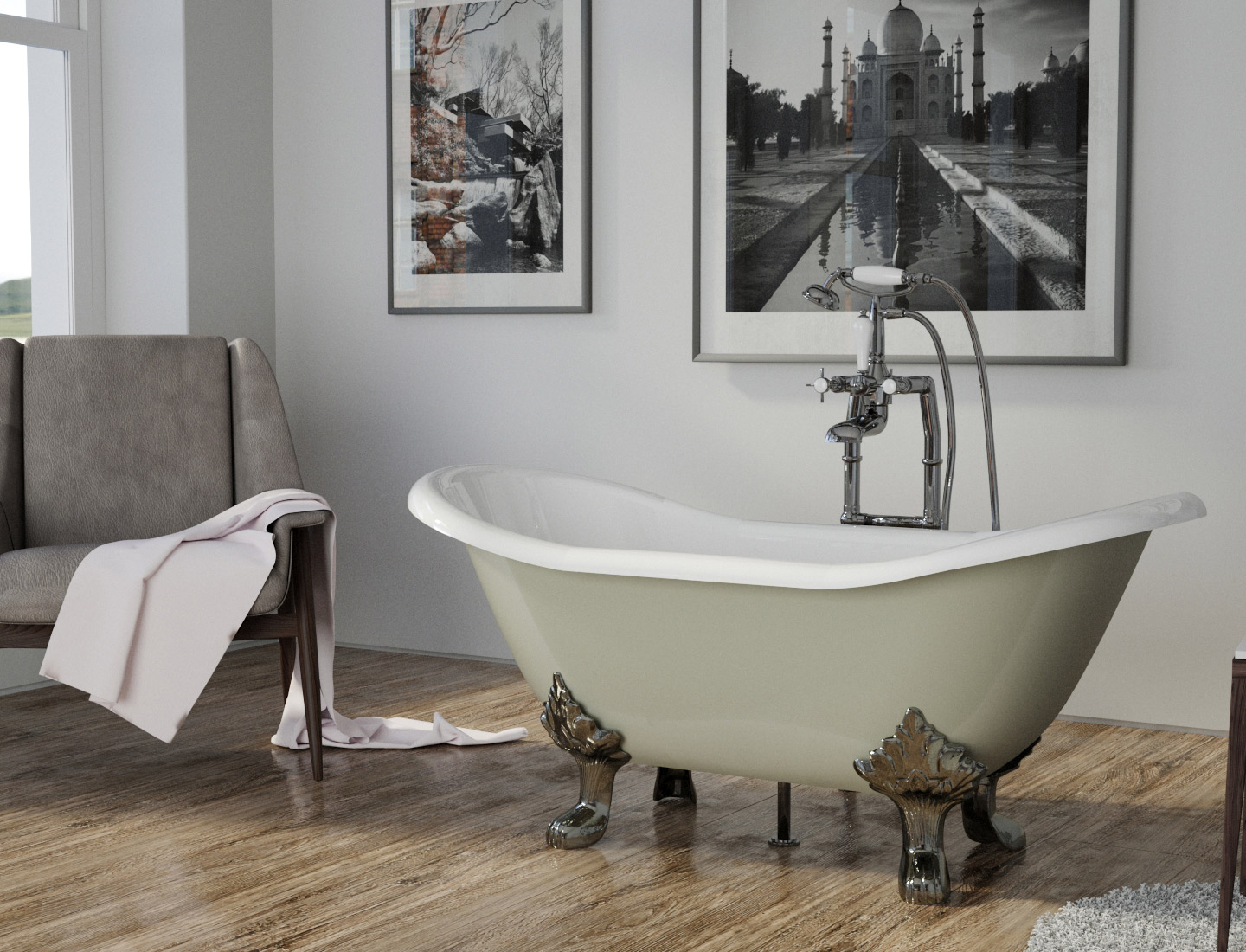 Find my Nearest StockistA cast iron double ended slipper bath and is available with or without tap holes. The exterior is painted in a colour of your choice and the interior is vitreous enamel. The feet are available in chrome or white and feature a lion's foot.